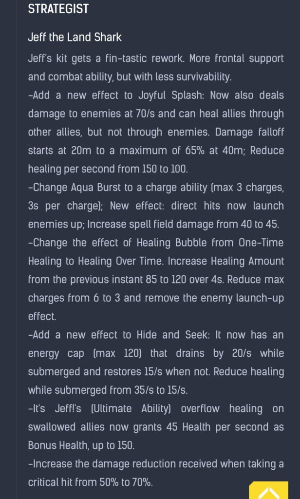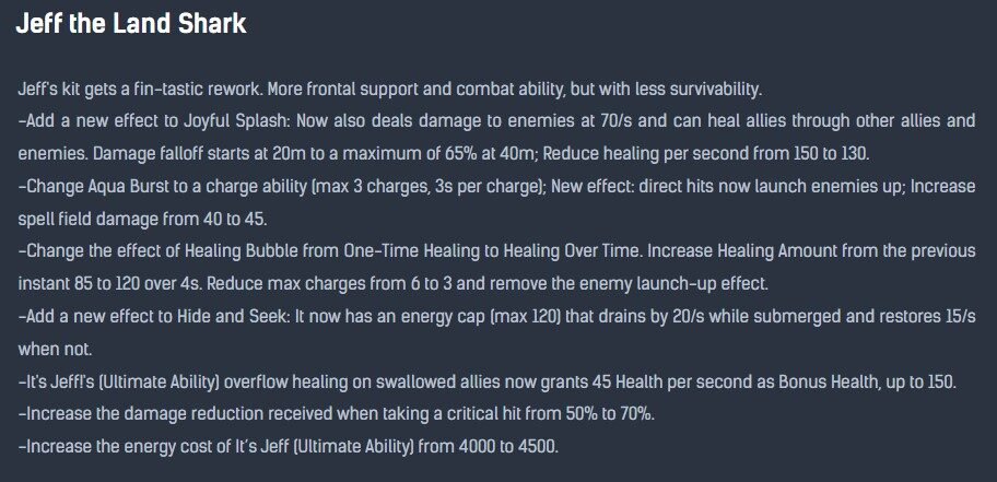 Here’s what went down. In the initial Season 2.5 notes, Jeff’s healing power took a dive: his splash heal was slashed from 150 per second to a measly 100, his ability to heal through enemies was axed, and his submerged healing was being cut down to 15 per second from 35. The message was clear — Jeff was getting benched.