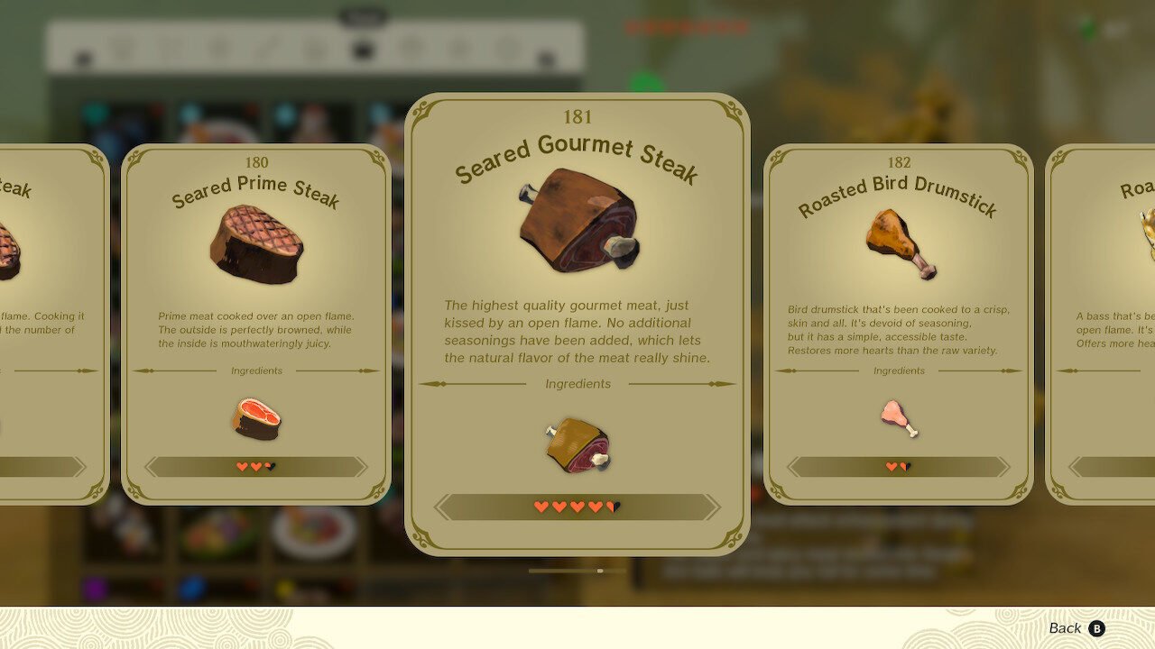 Gourmet Meat is hard to come by, but the bonus health is more than any other baked good. So if you see big-game like Water Buffalo, Tabantha Moose, or Honeyvore Bears, hunt them for their meat, and save it for the far reaches of the Hebra Mountain range, or the dark corners of The Depths.