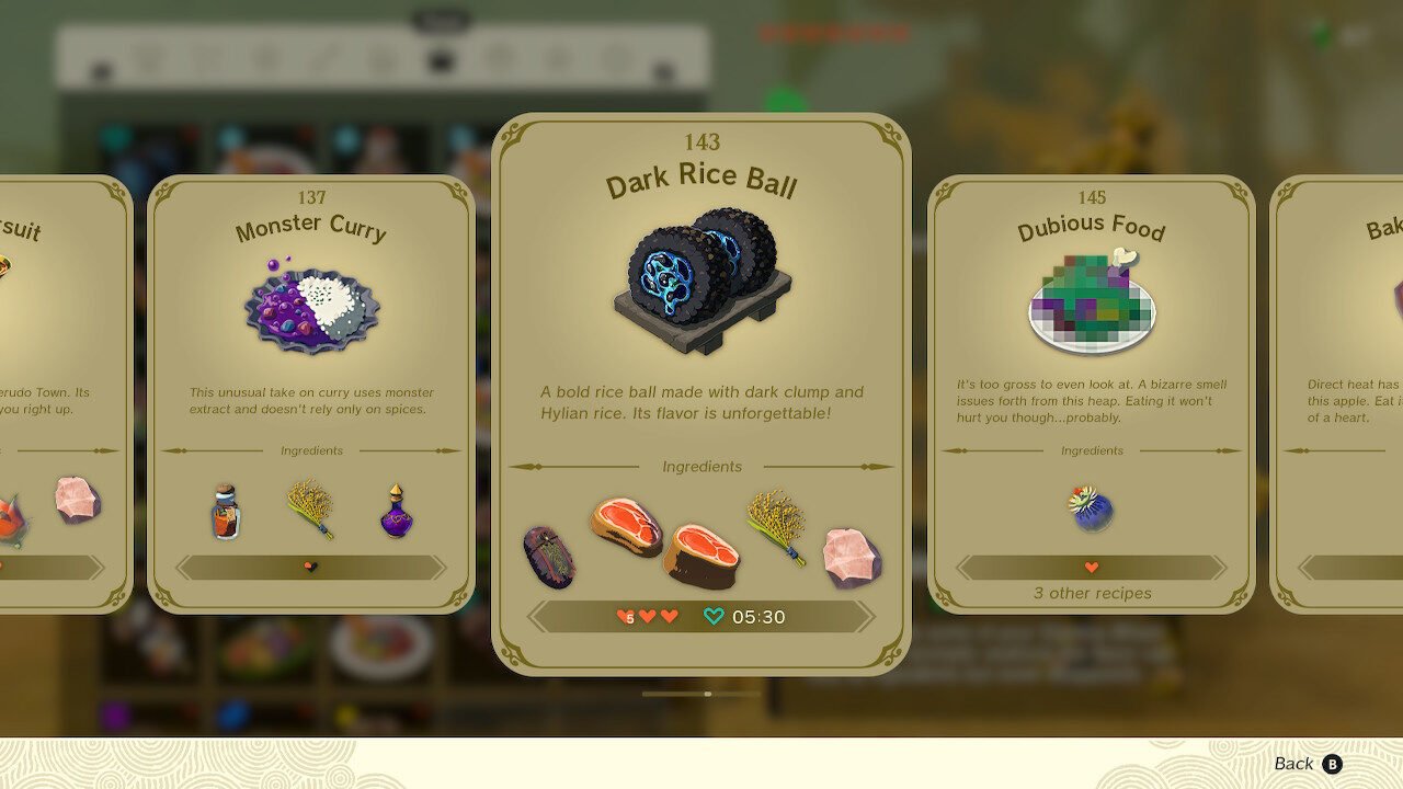 A Dark Rice Ball looks like it’d give you a stomach ache and worse, but somehow adding a “Dark Clump” to his dinner doesn’t curse Link, it protects him. If you’re braving the depths, buy Dark Clumps from a Bargainer statue, cook up a couple of dark dishes and eat. The Warding effect stops the Gloom from stealing his max health, and is a must-have for early-game depths-diving since you’ll have few hearts to spare.