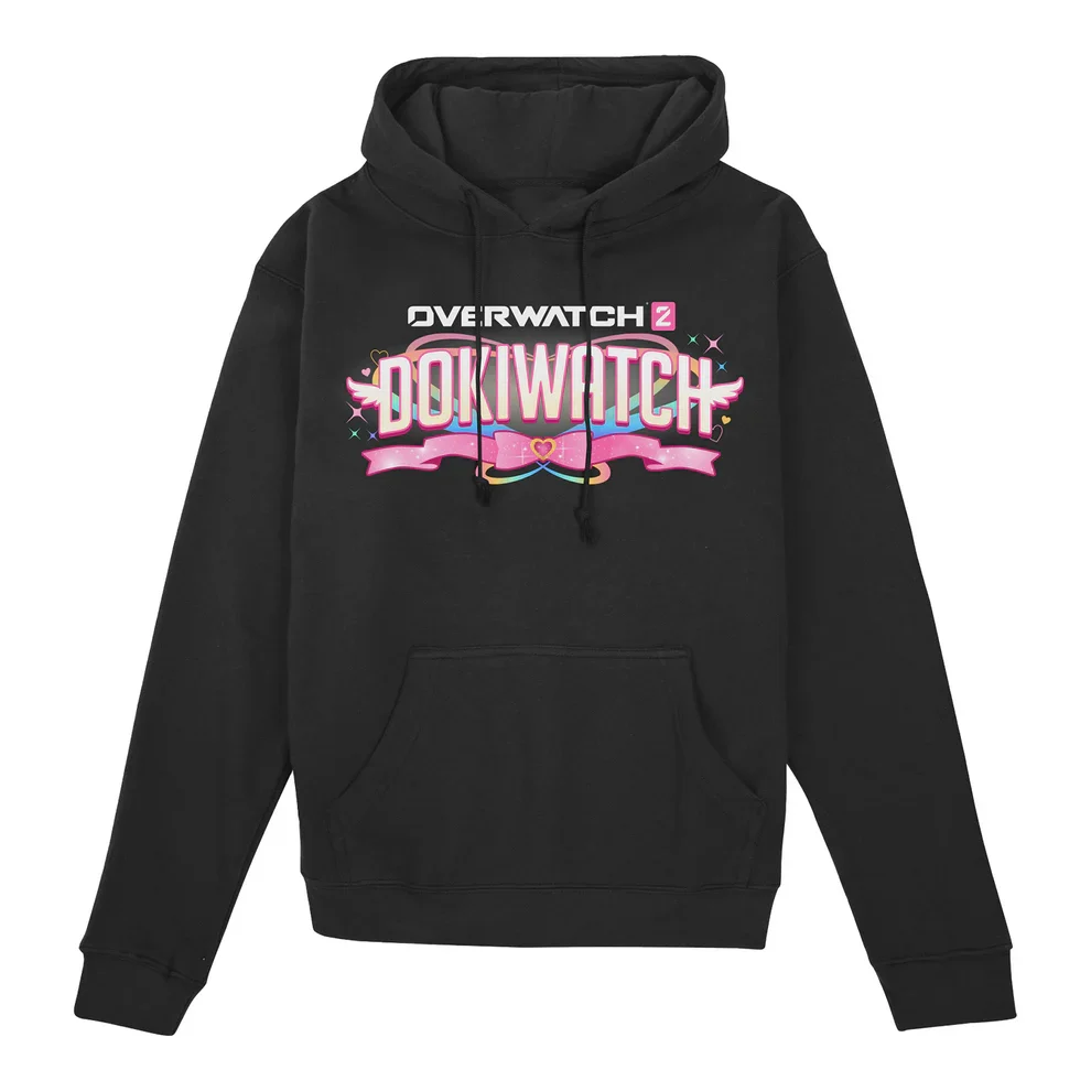 The Dokiwatch pullover hoodie features a more basic ‘Overwatch 2 Dokiwatch’ colorful logo on the front, but features a large heart-shaped print on the back containing the official splash artwork of all Dokiwatch heroes together – perfect for cozy comfort!