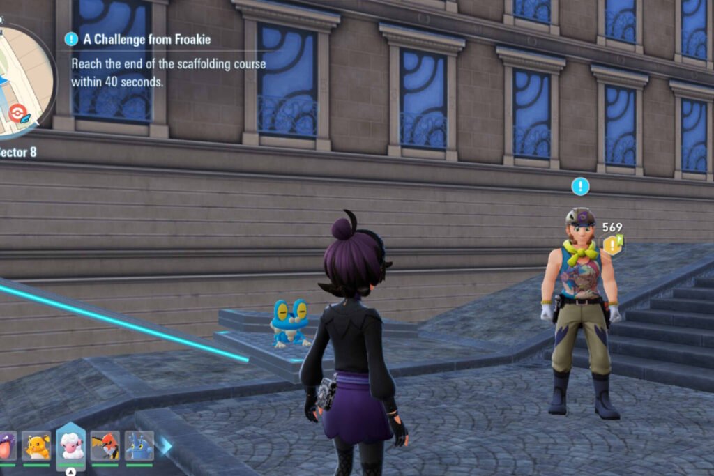 Once you reach this location, speak to Surv, and he will reveal that the nearby Froakie likes to challenge passersby to compete in the scaffolding course. During the scaffolding course, players must race to reach the top of the structure where Froakie waits before time runs out.