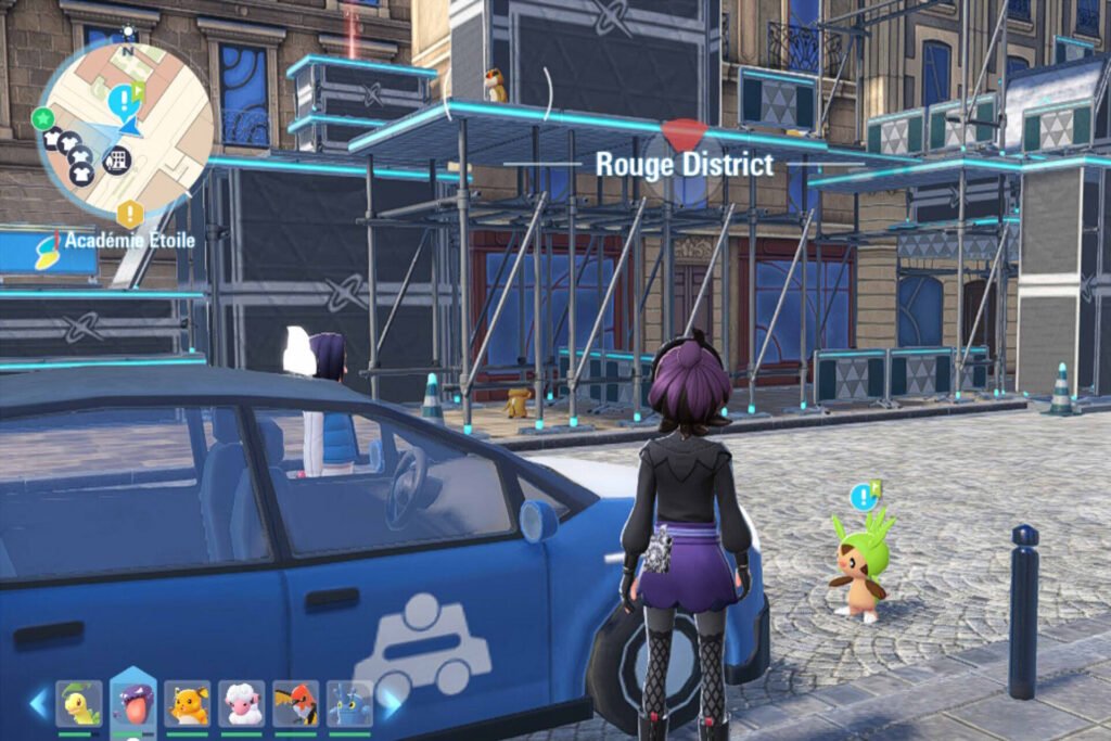 Axi and the Chespin can be found at Academia Etoile in the Rouge District. You should be able to see the little Chespin posed up in front of the taxi cab on this street, as referenced in the screenshot below. Speak to Axi, and she will reveal that Chespin is all amped up and blocking her car from leaving, as it is looking for a battle. It will now be up to you to defeat Chespin in battle!