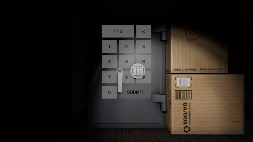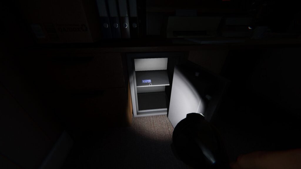 Go back to the manager’s office. Under the desk is a safe. Interact with the safe to prompt a keycode. Enter the code from before, 415, and select submit.