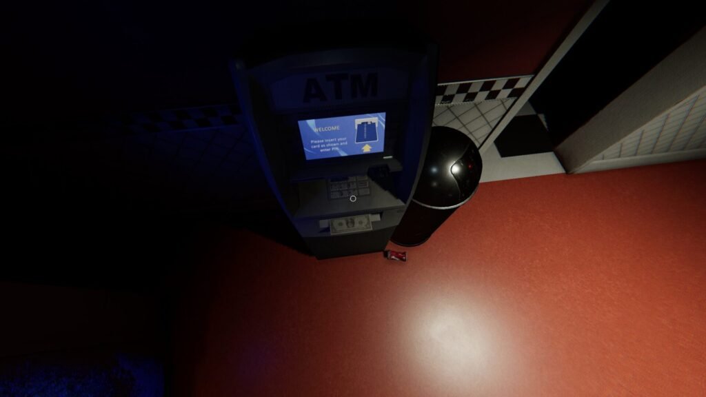 Bring the bank card to the ATM on the left side of the map, in the hallway. Once there, use the “place down” button (like if you were placing a camera or ghost writing book) to insert the card into the ATM slot.