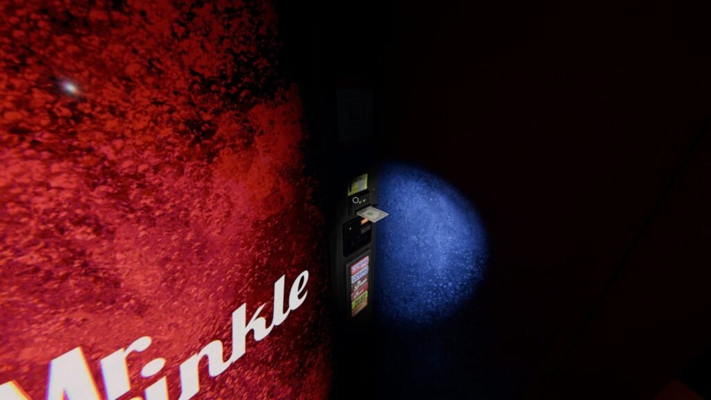 Once you do, a dollar bill will appear on the front of the machine. Take that dollar and turn left to the red Soda machine. Using the same button, place the dollar bill into the cash acceptor slot. This will cause a quarter to fall onto the floor.