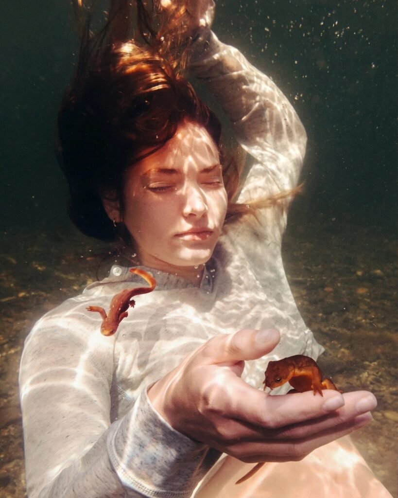 Thank you! This is a portrait of my friend Lauryn, she was visiting Oregon and some friends and I went swimming in a creek near my hometown. There was almost no planning involved in this, just an underwater camera bag and a few salamanders we caught that were native to the waterway. We only shot with them for about a minute or two, and didn’t want to stress them out unnecessarily. They also secrete a mild toxin that is best to wash off as quickly as possible. I was pretty excited to surface and see how it turned out.