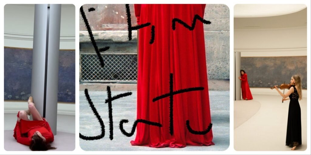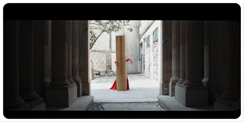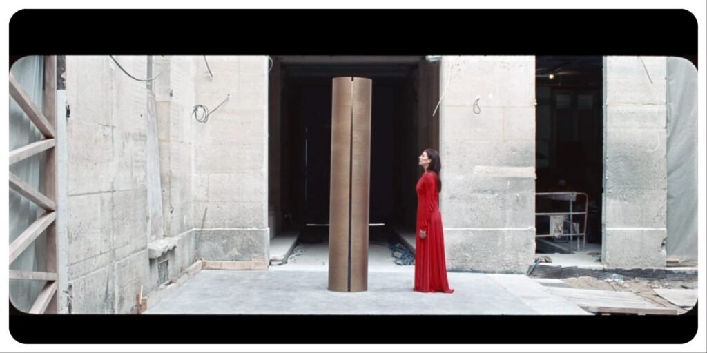 The film is built on sharp, contrasting images. At times, Gillot sits on a concrete floor in a vivid red gown, set against pale stone architecture and a towering bronze sculpture. The sculpture’s rigidity becomes the counterpoint to her impending movement, setting up a tension between the living body and inert form. The scene captures the film’s central idea: performance as a moment suspended between stillness and release.