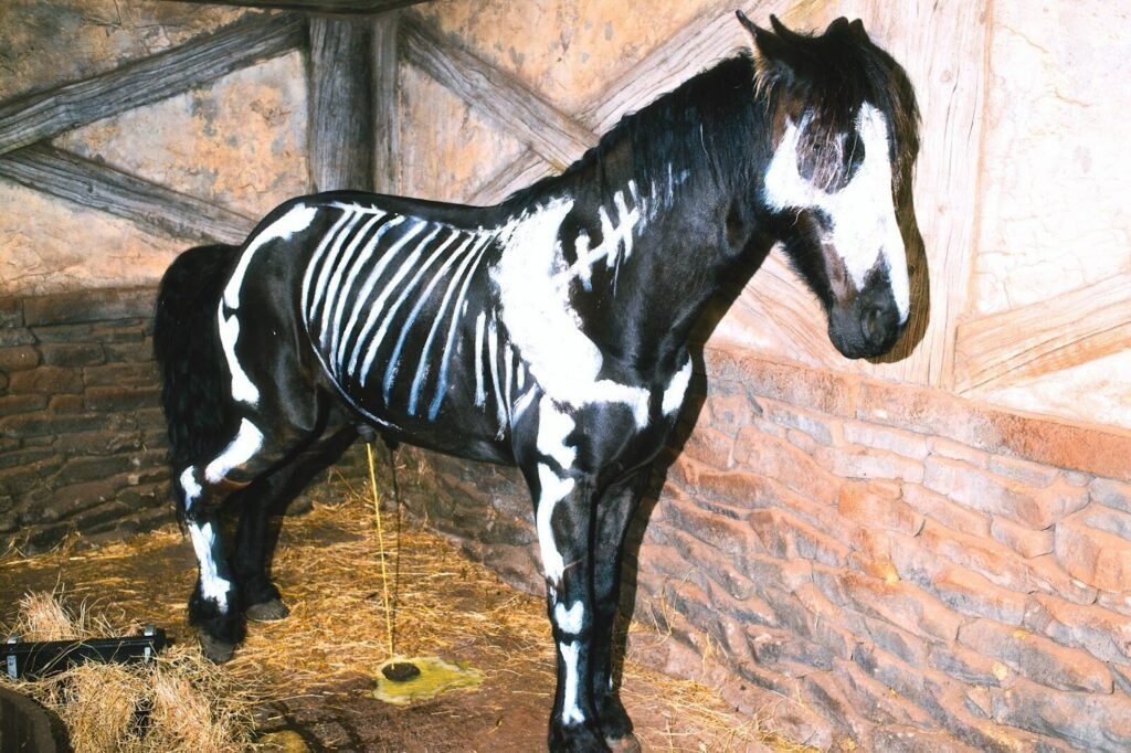 I had moved to Melbourne a few months earlier, and was still kind of bumming it looking for work. My partner Lauren and I had ventured up to Ballarat for a halloween event at Kryal Castle (A medieval/ fantasy theme park). After a jousting and sword fighting show one of the horses was taken back to the stable, still painted in skeleton paint. It was pitch black, so I couldn’t really see what I was doing, the only light was from the flash. I looked at the photo and saw it was pissing.