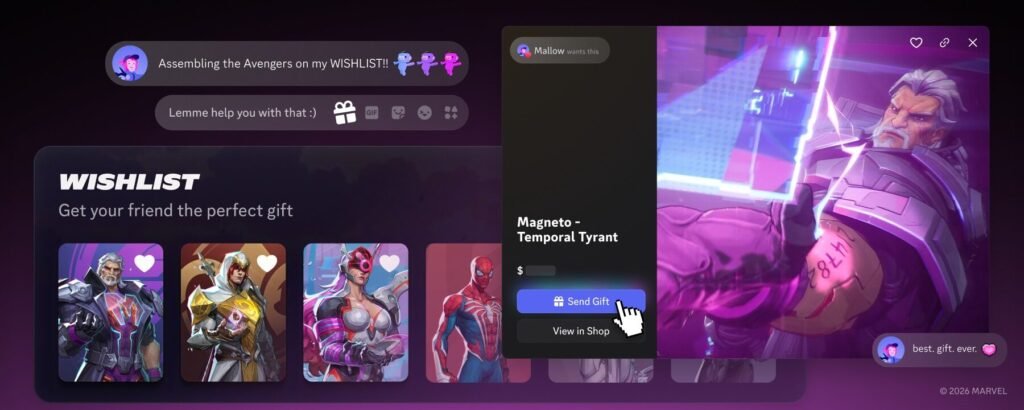 The shop also introduces several social-driven tools, including wishlists that can be viewed on user profiles. Players can check what cosmetics their friends are hoping for and send gifts directly through Discord DMs.