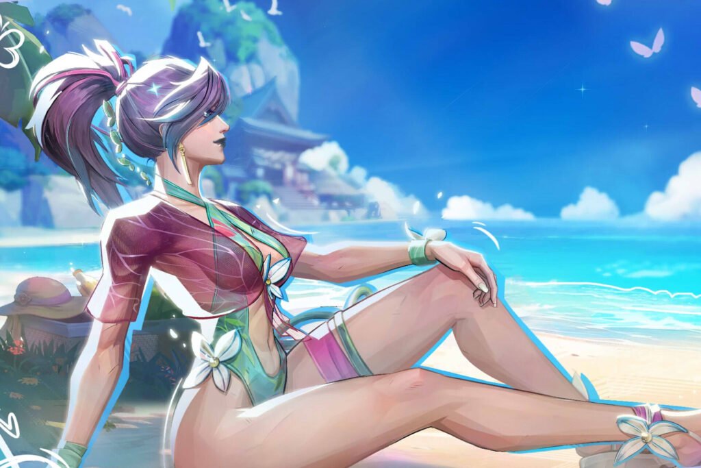 The color palette is soft and summery, right on theme. Furthermore, there are an additional two color variants to choose from, featuring purple and yellow options. There are also beautiful details such as the little flower decals on her swimsuit and footwear, the fish charm on the end of her blade holster, and the butterfly-shaped hair charms. And to top it all off? It features some pretty nice sound effects for her Ultimate Ability, making her gameplay even more satisfying.