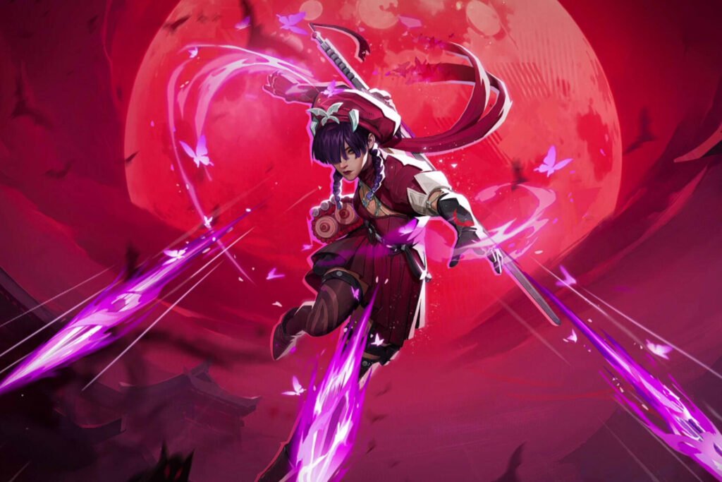 It comes in a deep, rich red color for that ‘bloody’ theme, and is packed full of tiny details to admire. From the unique bangs-and-braids hairstyle to the scrolls on her hip or tiny little bottles holstered to her thigh, this skin paints a very fun portrayal of the character, leaning heavily into assassin themes. This makes sense, considering the ‘Blood Kariudo’ title, roughly translating into ‘Blood Hunter’.