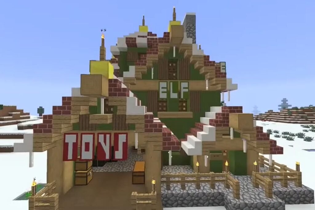 Another build worth checking out is this Elf Toys Workshop, which adds more child-like fun to your Minecraft world. It has an open-garage-like design that mimics an actual workshop where you can craft gifts or items you want to give out to your friends in your server.