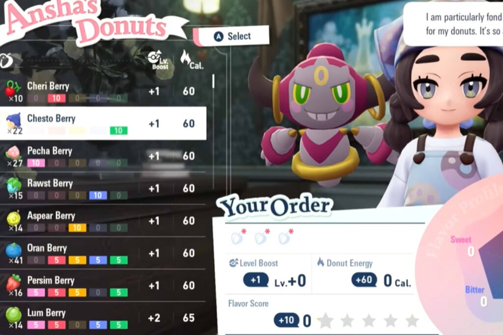 To make donuts in Pokemon Legends Z-A, head to Hotel Z-A and speak to Ansha. You will then be able to mix and match different Berries from your inventory to create a Donut recipe/order. Trainers can experiment with different combinations of Berries to gain different effects.