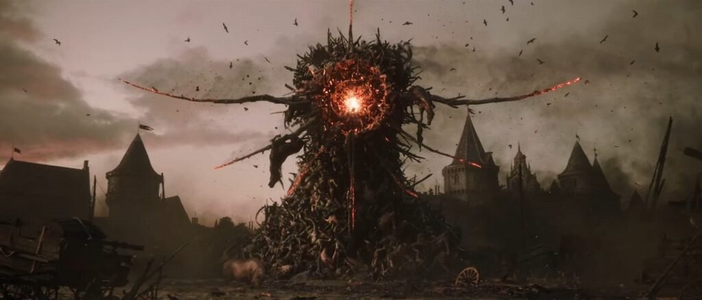 Larian opens Divinity with a fantasy festival. As dwarves, elves, and lizardmen dance and play, the chat was going wild with “Witcher 4?” “Elder Scrolls 6!”. Slowly, the festival takes a dark turn as a mask priest approaches a giant woodeen effigy; inside it, a man struggles as the chanting rises. A flame is lit and the people start hurling torches until the effigy roars to life. The man inside burns alive until his body bursts with demonic energy and the people flee. In the end, all that’s left is the hellstone.