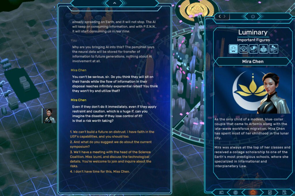 “The political drama set in a future that’s too close for comfort. Become the first mayor of ARTEMIS: A Pioneering Lunar City. Navigate the future of lunar colonization, choose between independence and cooperation, shape policies for or against AI influence, and tackle interplanetary conspiracies.”