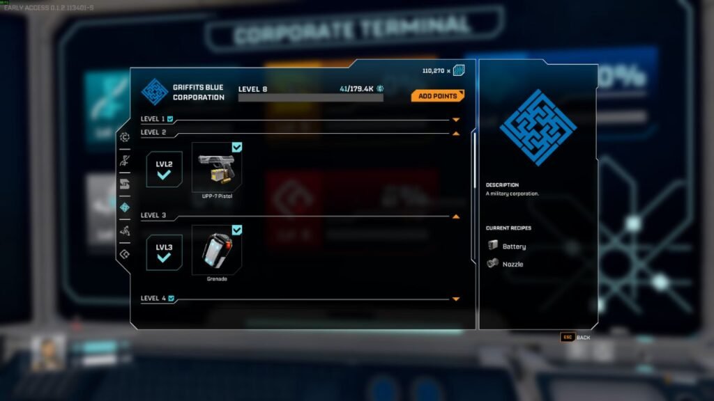 The first weapon you’ll get in StarRupture is the UPP-7 Reaper Pistol, which you unlock as a reward for reaching level 2 with Griffits Blue Corporation. It’s nothing fancy, but it definitely beats running away from every Vermin you come across. Keep working with the corporation, and you’ll unlock grenades at level 3.
