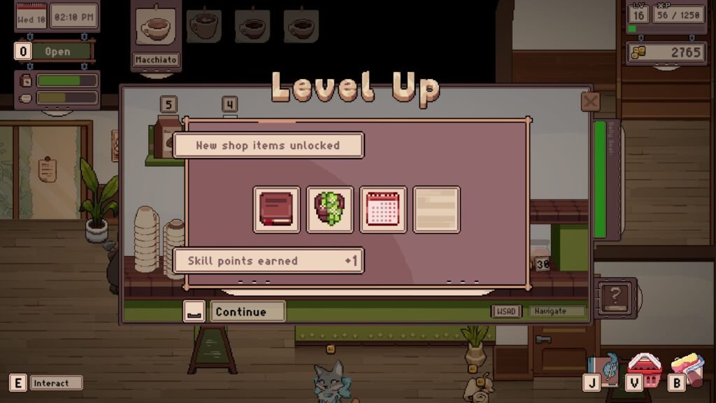 This is also where I feel the game is a little confusing. Surely, the recipe book, which is sitting on the counter where you brew coffee and steam milk, would contain drink recipes to unlock? That seems like the logical place to unlock more coffees, not your journal. For a while, as I played, I even forgot there were other upgrades in the recipe book, so focused was I on trying to level up, gain skill points, and spend them on new coffee types.