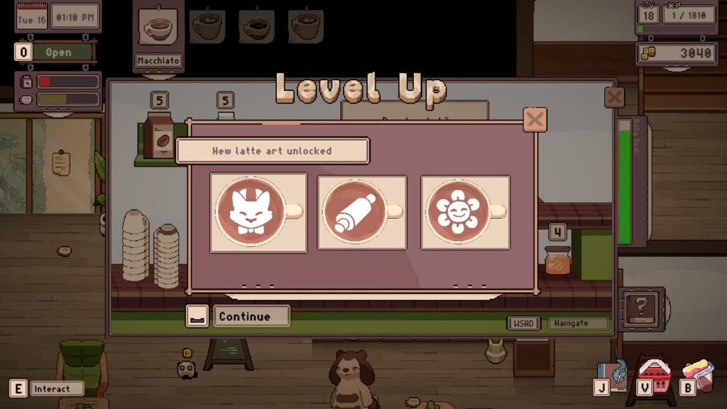 One of the first skills I unlocked was to remove the need to manually complete latte art, as so many customers asked for a latte, and it was taking up a lot of time. As I was keen on making money, this felt like a good investment (it costs five skill points to unlock this ability), but this is a regret of mine. As you level up, you also unlock more latte art, but thanks to the upgrade, I never get to use them. It is possible to reset your skill points for 1000 Coins, so that is certainly an option for me… And maybe I could spend them on unlocking the mocha instead.