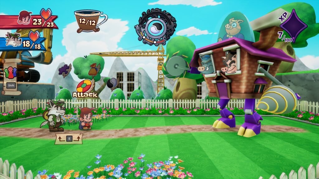 The enemies you’ll encounter are also no exception to how personalized each enemy type’s moves are. Some can fly, which requires you to use attacks that can shoot them down to the ground. Other characters have buffed shields that Tinder’s flames can’t use. A very unique set of moves I’ve seen is when one of the Three Little Pigs presses a button to summon a herd of Robot Pigs to swarm and attack you.