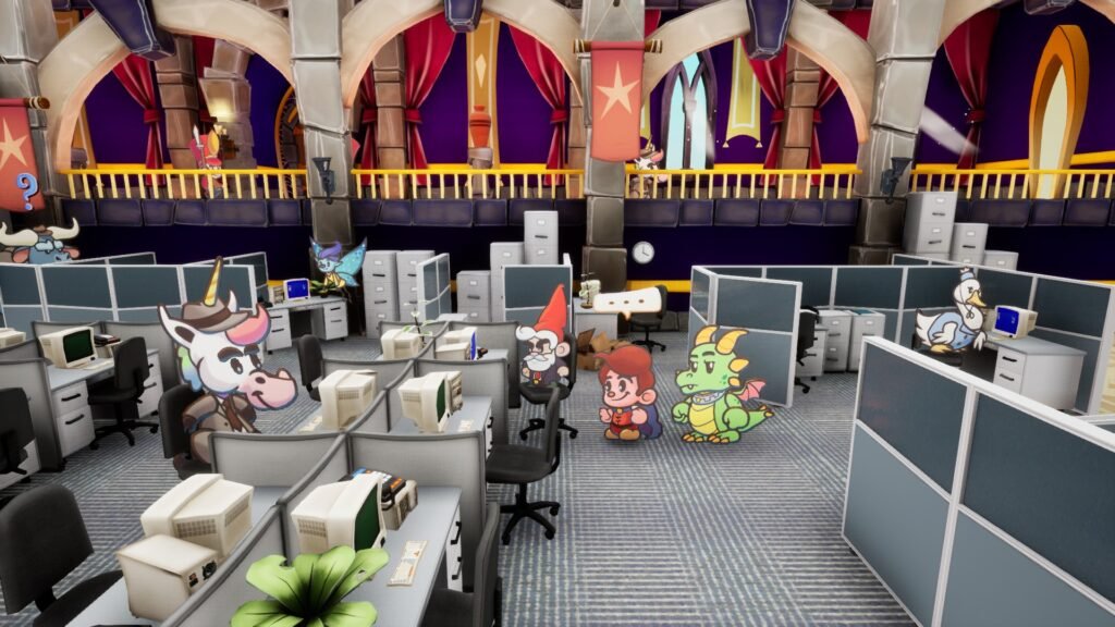 You can expect to see bright greenery with colorful butterflies, cottages filled with items to find, and NPCs to meet. Sometimes, an out-of-place copying machine is also found there, so you can save your game. This pushes that clashing corporate and fairytale narrative outside of your office quarters.