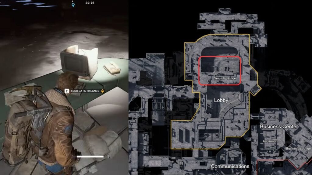 To find the Reception Computer, head to the Lobby area. You can find the computers on the bottom floor, below the Security Bridge, sitting on the green reception desks. Interact with the computer, and you’ll complete the first task.