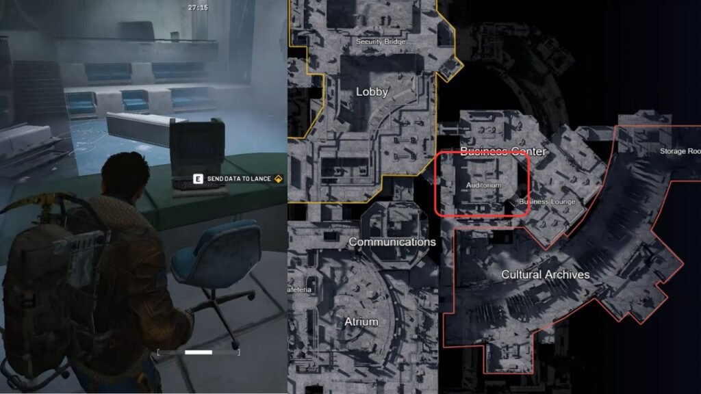 To find the Lecture Notes, head to the Auditorium on the 4th floor of the Business Center. Inside, you’ll spot a computer sitting on the lecturer’s stage. Interact with it to complete the second task.