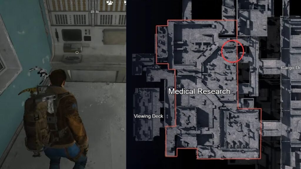 Once you reach the Medical Research building, head upstairs and look for a room on the eastern side of the building. Inside, you’ll find a huge old computer rig in the corner of the room. Interact with it to complete the third task.