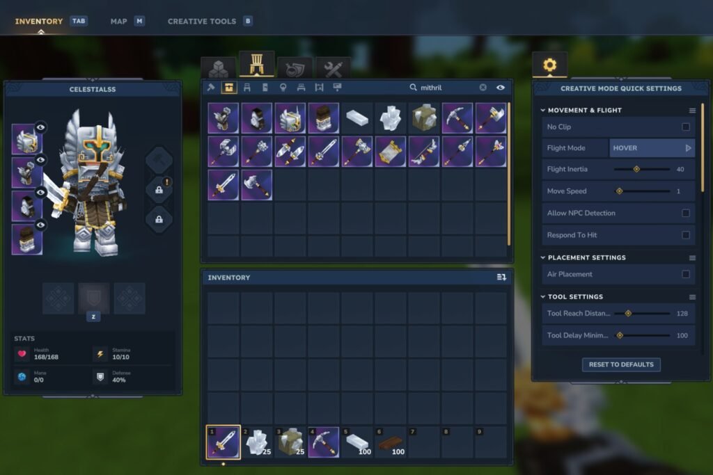 Now, anytime you press the “O” key, you will switch between Creative and Adventure mode. Mithril will be available for you to spawn from the Creative Mode item menu if you search for it.