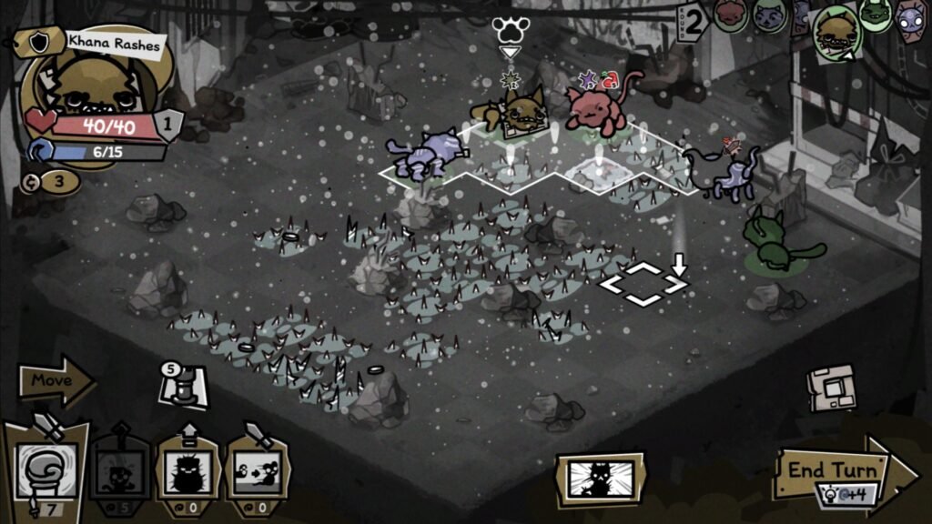 Lucy starts in the center of the map, but there are tons of thorny spots on the ground. Be careful where you’re stepping, and remember that you can avoid them by making a trail for your cats to move instead of simply choosing where they should move directly to.