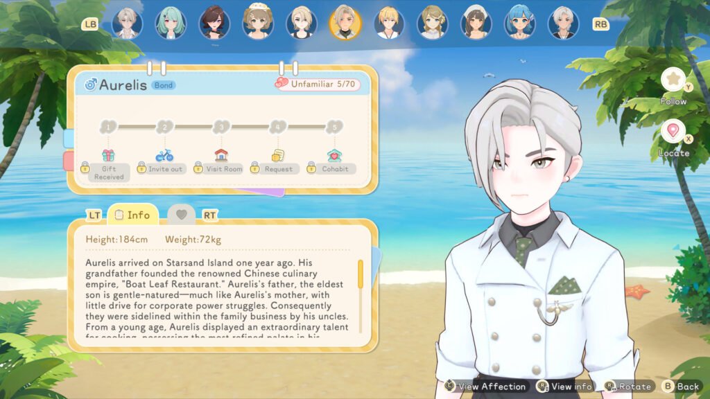 Something you’ll quickly notice about Starsand Island is that there’s a truly above-average number of suave silver-haired gentlemen running around (Gojo Satoru, who?). Top chef Aurelis is among them, and so long as you don’t mind the fact that he tells you that you smell the first time you meet him, he’s an eligible bachelor looking to settle down.