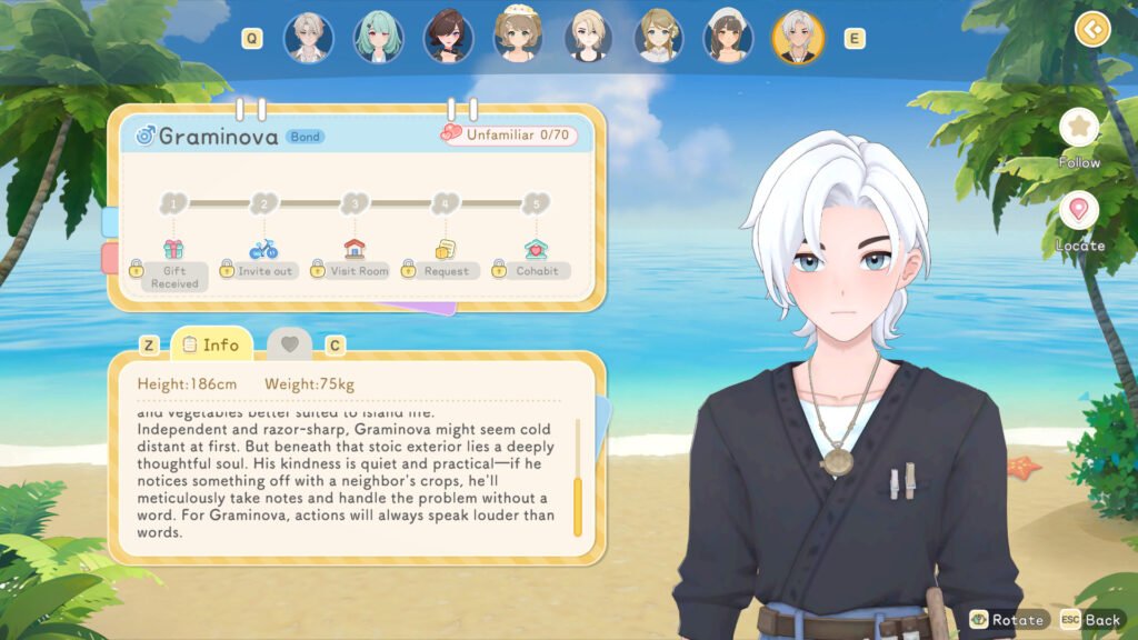 Francis has called Starsand home since he moved here to live with his aunt as a child. Back then, you two were childhood friends, before you left the island. He’s passionate about everything the sea has to offer, from fishing to surfing. He also takes care of the island’s deep-sea observatory, where you can join him to watch fish and whales in their natural habitat.