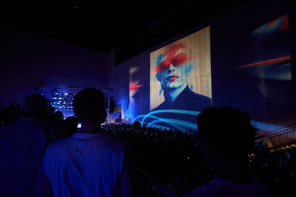 Projected on the side of the power station were abstract, AI-generated animations of Bowie à la music videos for each song. ‘Space Oddity’ had an astronaut exploring a Daliesque planet, ‘Golden Years’ had Bowie dancing in gold, glittering in film halation. Each was mesmerising and certainly a colourful addition to the event, but some will decry Perth Fest’s use of AI.