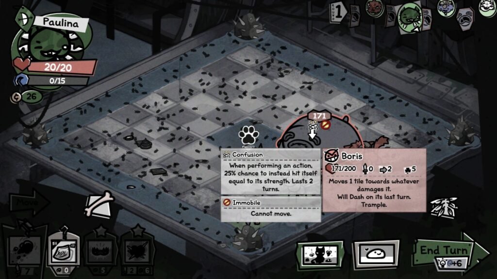 Boris has another tricky move called Trample Dash. Only performed on his last turn of each round, Boris will charge into one of four directions, dealing a massive amount of damage to anyone in the way. Avoid this move by making sure that by the end of the round, all of your cats are outside of his trampling range.