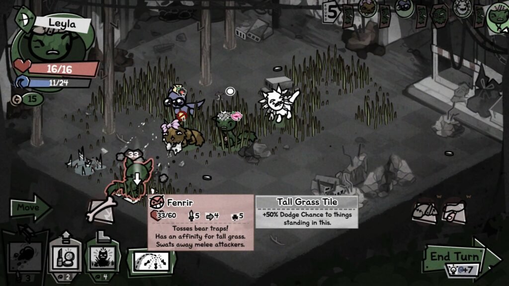 To get rid of the tall grass, you should have a cat that can either burn the grass or flatten it with water. This will make it so Fenrir can’t simply hide behind the grass and avoid most hits. Otherwise, if you’re stuck with the grass, try to use it to your advantage by ending your turn while standing in it.