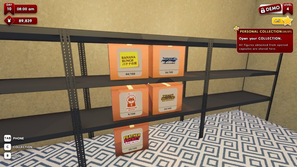Besides that, I like how you can stack gacha capsule products with each other when you purchase new supplies. That’s one experience I’ve appreciated with this game. It helps avoid having too many boxes in your storage room, especially in the early game.
