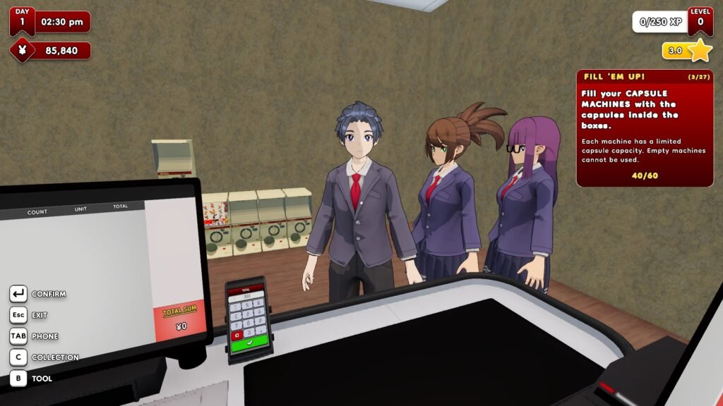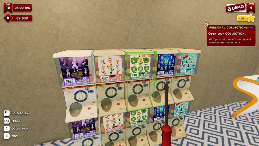 At its core, the gameplay is straightforward: you manage your capsule shop by stocking machines, maintaining the machines with a screwdriver (or hilariously whacking it with a bamboo stick), serving customers who want their bills exchanged, checking out their purchased figurines, and more.