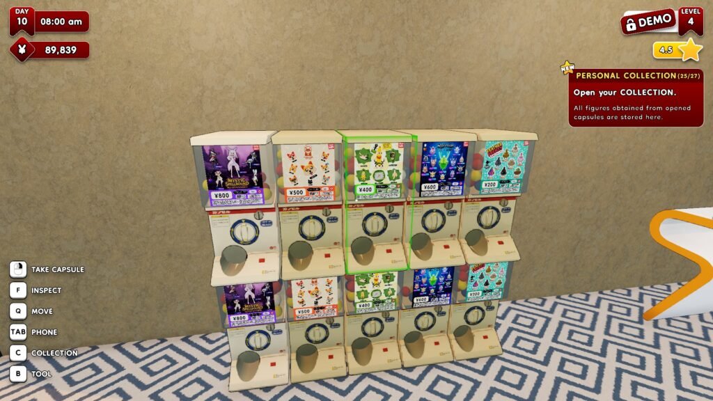 This taps into the same satisfaction as opening gacha capsules and blind boxes in real life. Even if it’s limited in this demo, you’ll be thrilled over the satisfaction of the goofy figures you might get, with some inspired by some internet memes. Its gameplay may be rooted in a management sim, but its uniqueness comes from its concept of running gacha shops in Japan.