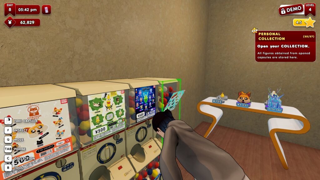 As you begin the game, you familiarize yourself with your new gacha capsule shop in the buzzing electric town of Akihabara. With its bare bones and all, you can name your shop, and you’re guided by a small window on the upper right of your screen on the tasks you’re supposed to do to kickstart your business.