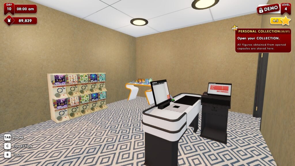 You start by ordering a few gacha capsule lines, additional machines, renovating your shop’s interior, and even increasing brand awareness through ads and events via your phone. After stocking your machines, you can open up shop and wait for customers to come in.