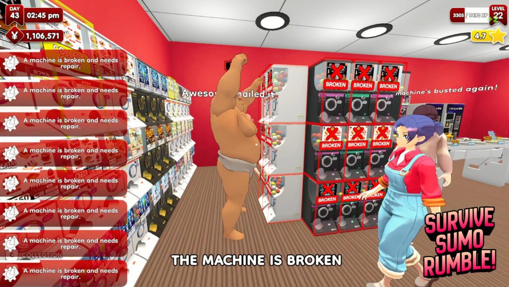Sometimes you even have to pull out a bat to whack away the yakuza coming into your store. Other times, it’s a sumo wrestler who stomps right in and breaks all your machines.