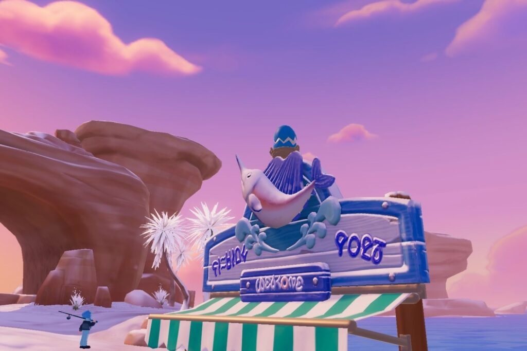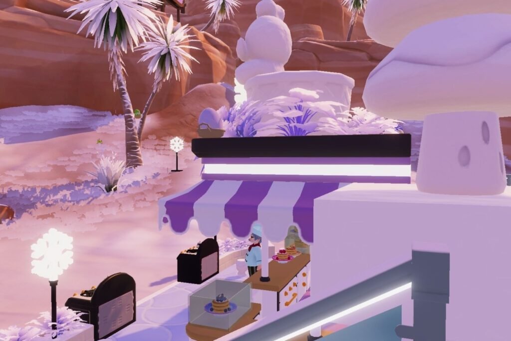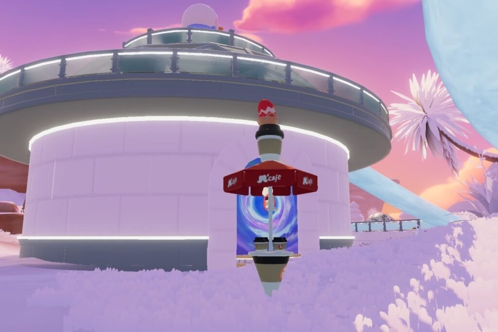 The Purple Cracked Egg is atop Massimo’s Kitchen Stall on the awning, where the Lavender Cracked Egg was found. To take a snapshot easily, move up the ice rink’s stairs towards the awning.