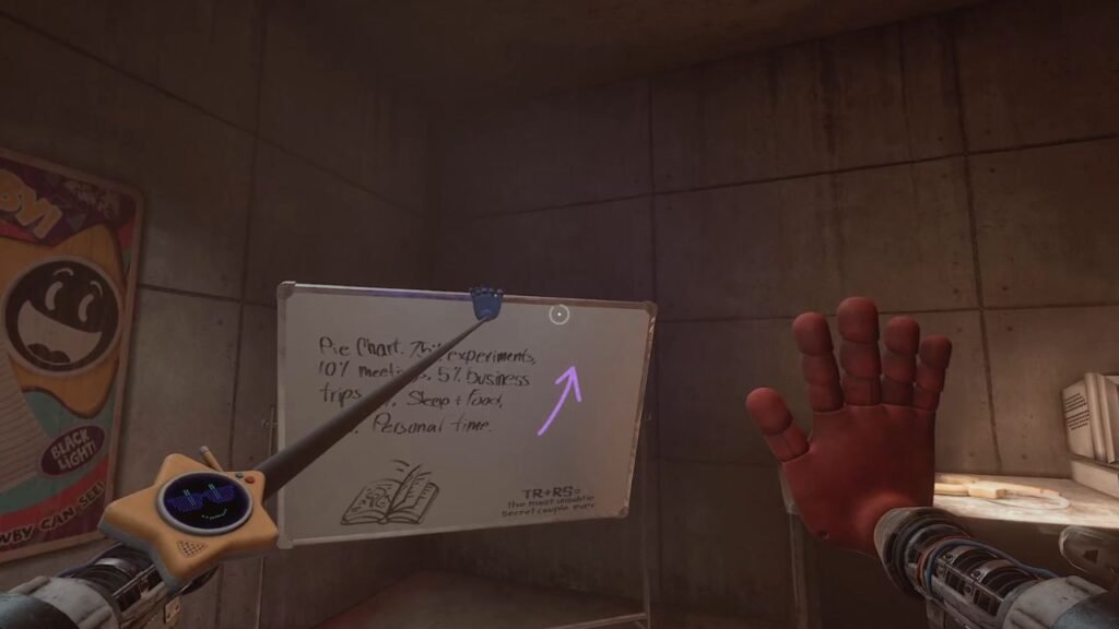 To find the code, flip the whiteboard in the opposite corner of the same room. Attach your Grabpack to the edge of the board and hold the left mouse button to turn it.
