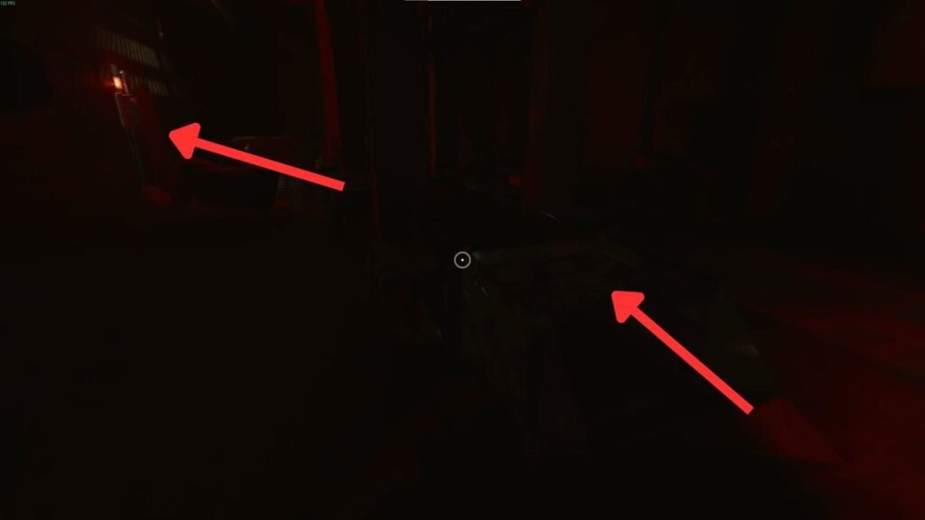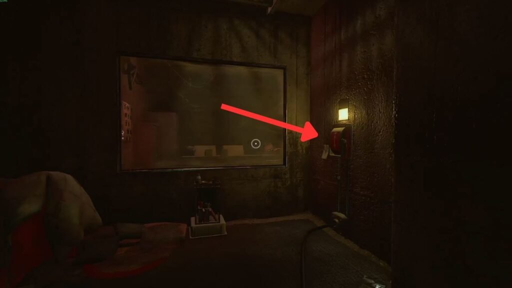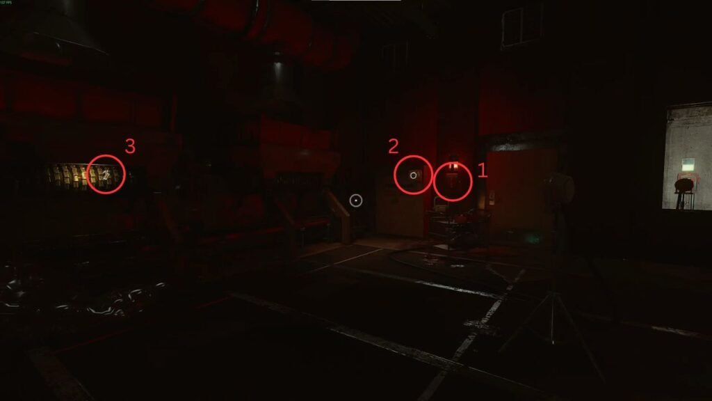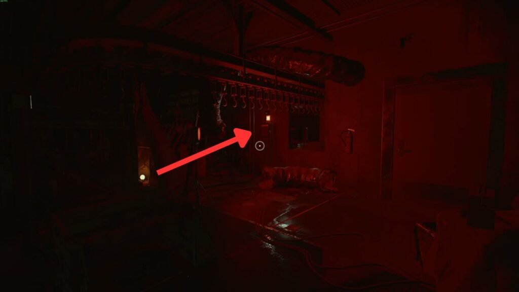 First, pull the red lever in front of the glass to turn on the hallway lights. Next, head toward the window opening that leads to a small factory area bathed in eerie red lighting.