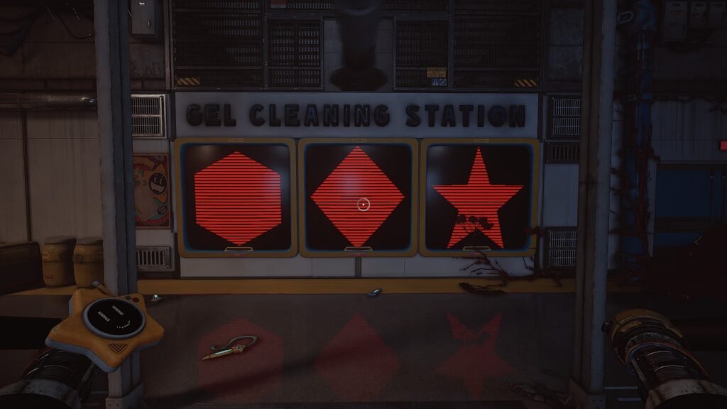 When you first enter the Gel Cleaning Station, you’ll see a large wind turbine and a screen displaying three red shapes. These shapes are randomized for each player, so there’s no single universal solution.