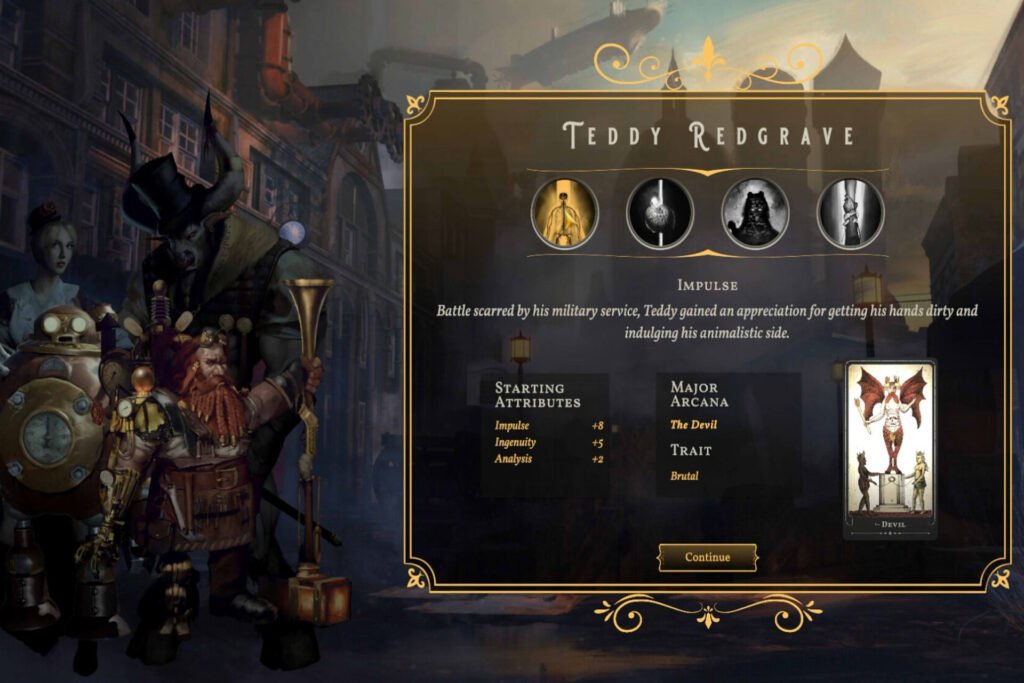Sovereign Syndicate is a narrative-heavy CRPG set in a Victorian steampunk universe. The game immediately stands out for its aesthetics, memorable characters, and tarot-driven mechanics.