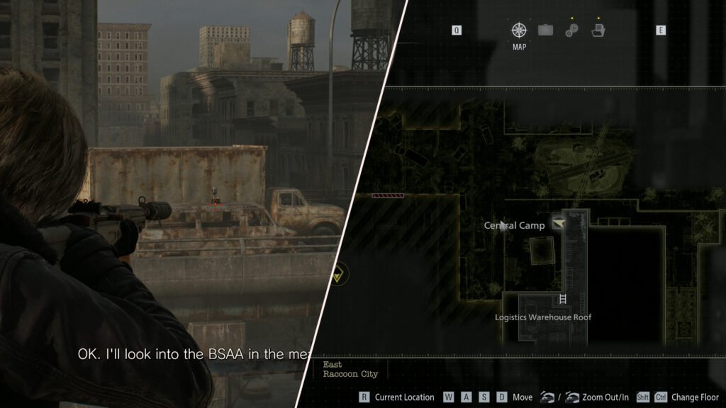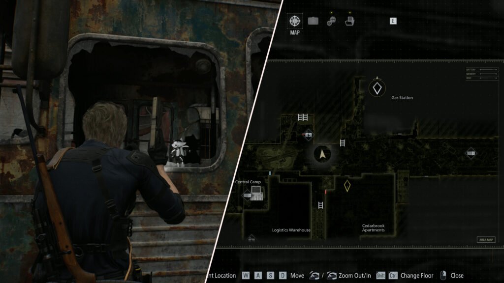 Once you have access to the Logistics Warehouse Roof, there will be an elevator that Leon can use later. However, if you stand in the elevator before heading down to the Central Camp, you can see Mr. Raccoon dancing from atop a car on the overpass above the camp.