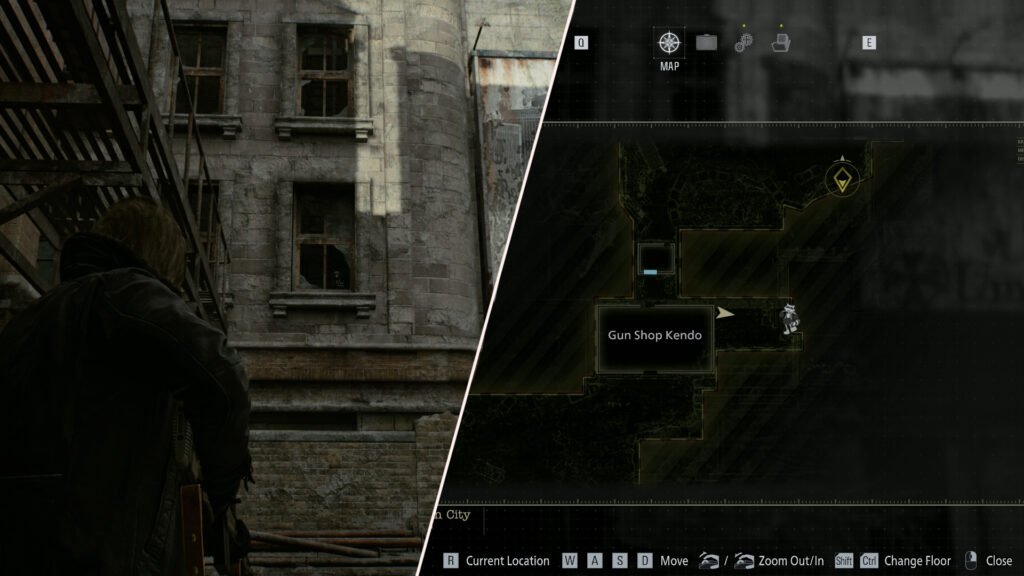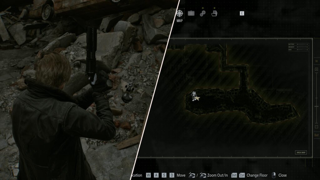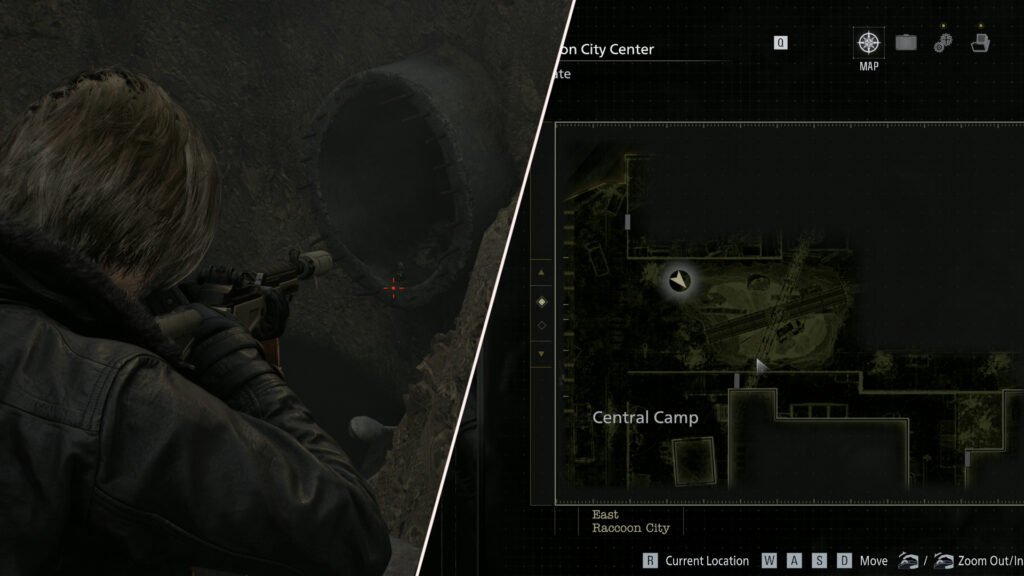 Progress further with Leon, leaving the subway. Outside of the Central Camp portion of the map, there will be a sinkhole in the street. If you look into the sewer drain below, you’ll see another figure on the edge of it, ready to be shot.