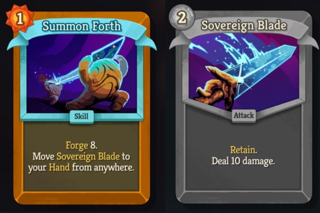 Summon Forth | Costs 1 Energy | Forge 8. Put Sovereign Blade into your Hand from anywhere.