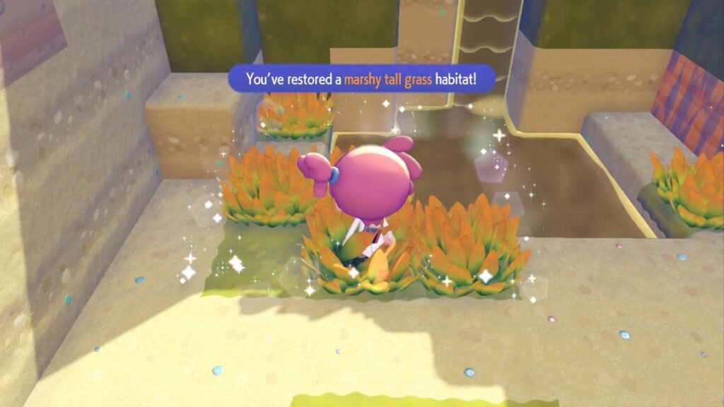 To summon Paldean Wooper in Pokemon Pokopia, you need to make the Marshy Tall Grass habitat. You can find muddy water required for this habitat at Bleak Beach, and you just need x4 tall grass planted along the muddy water.