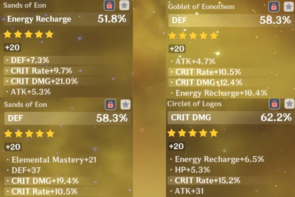 You want at least 3000 DEF for the full EM buff. Anything above that is good for her healing. Her energy needs may fluctuate depending on whether there is a Favonius holder on the team. Crit ratio should be 1:2, e.g., if you have 180 Crit DMG, aim for 90 Crit Rate.